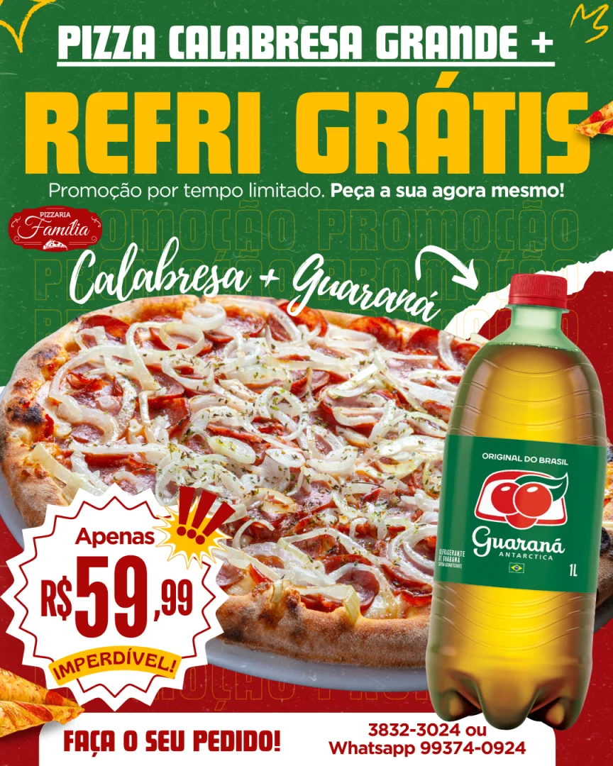 Aproveite nossa promoção incrível somente essa semana!❤️ Pizza Calabresa + Guaraná 1l por apenas R$ 59,99! Peça agora no delivery da Pizzaria Família.